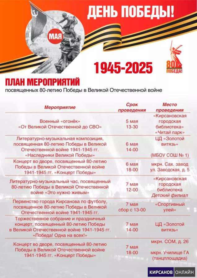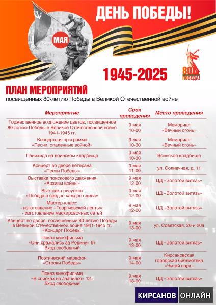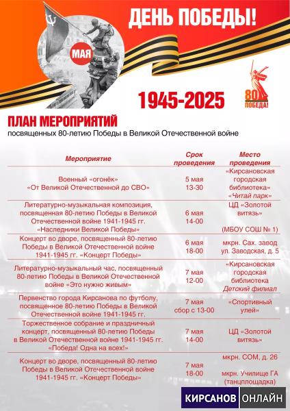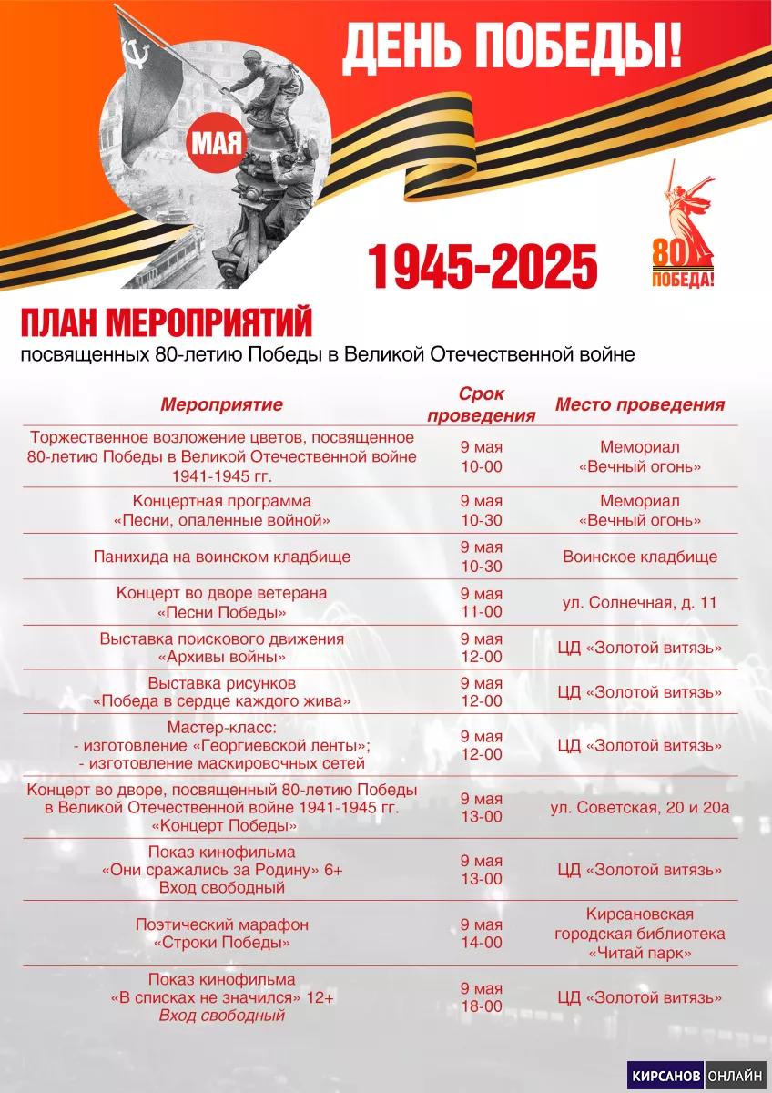 Уважаемые жители города Кирсанова! Мы представляем вашему вниманию актуализированный план мероприятий, посвященный 80-летию Победы в Великой Отечественной войне.