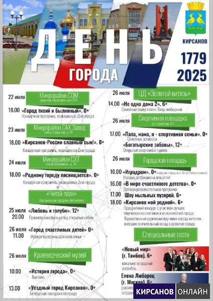 В субботу, 26 июля, Кирсанов отпразднует свой день рождения! Приглашаем жителей и гостей города присоединиться к большой праздничной программе, которая обещает множество ярких событий и незабываемых впечатлений.