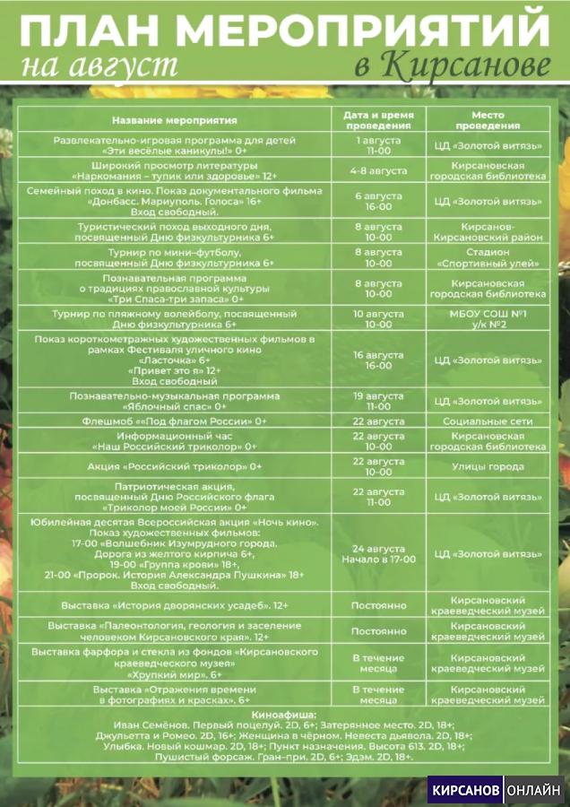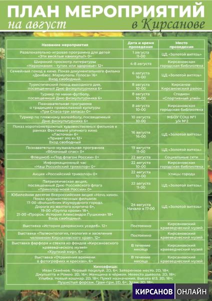 Встречайте план мероприятий в Кирсанове на август