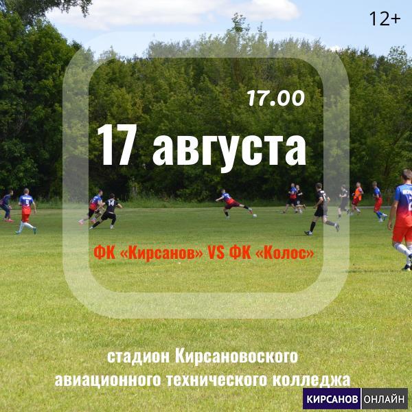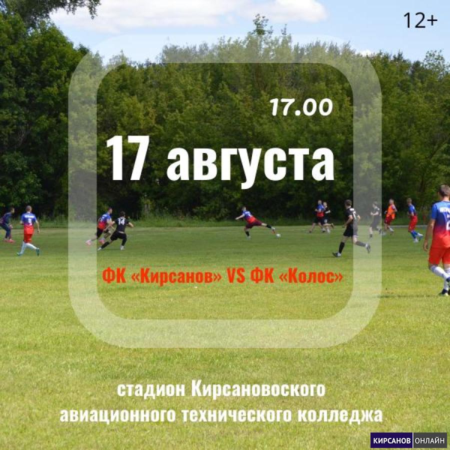 В рамках Чемпионата РОО «Спортивная федерация футбола Тамбовской области» на стадионе Кирсановского авиационного технического колледжа пройдёт футбольный матч. 17 августа в 17:00 встретятся команды ФК «Кирсанов» и ФК «Колос». (12+)