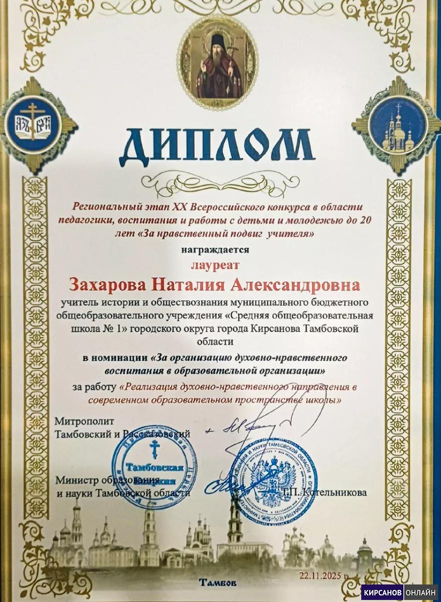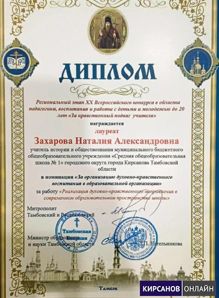 В торжественной обстановке вручены архиерейские грамоты, благодарственные письма и дипломы регионального этапа конкурса. Среди награждённых — представительница Кирсанова. Лауреатом регионального этапа XX Всероссийского конкурса в области педагогики, воспитания и работы с детьми и молодежью до 20 лет стала Наталия Захарова, учитель истории и обществознания школы № 1 города Кирсанова. Наталия Александровна отмена дипломом в номинации «За организацию духовно-нравственного воспитания в образовательной организации».