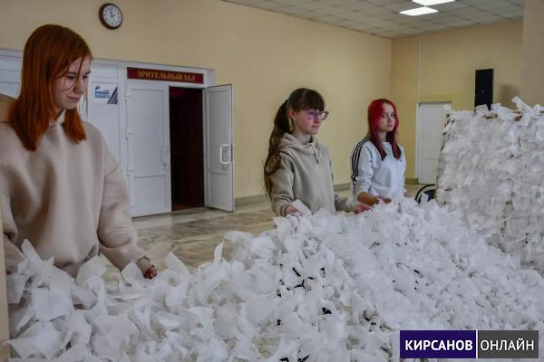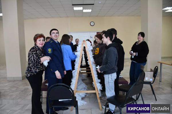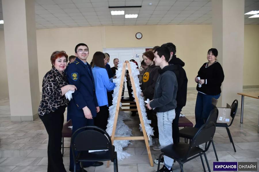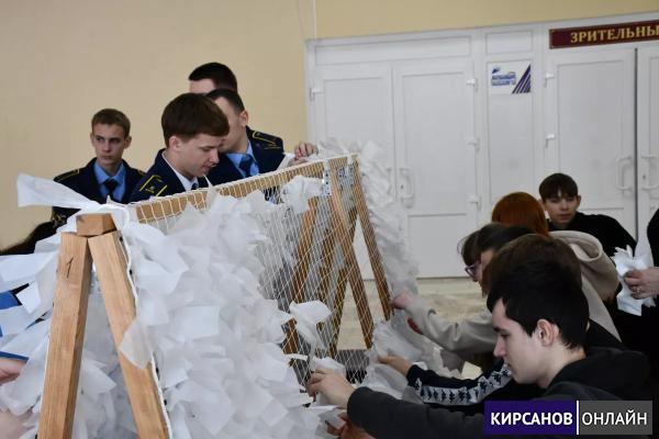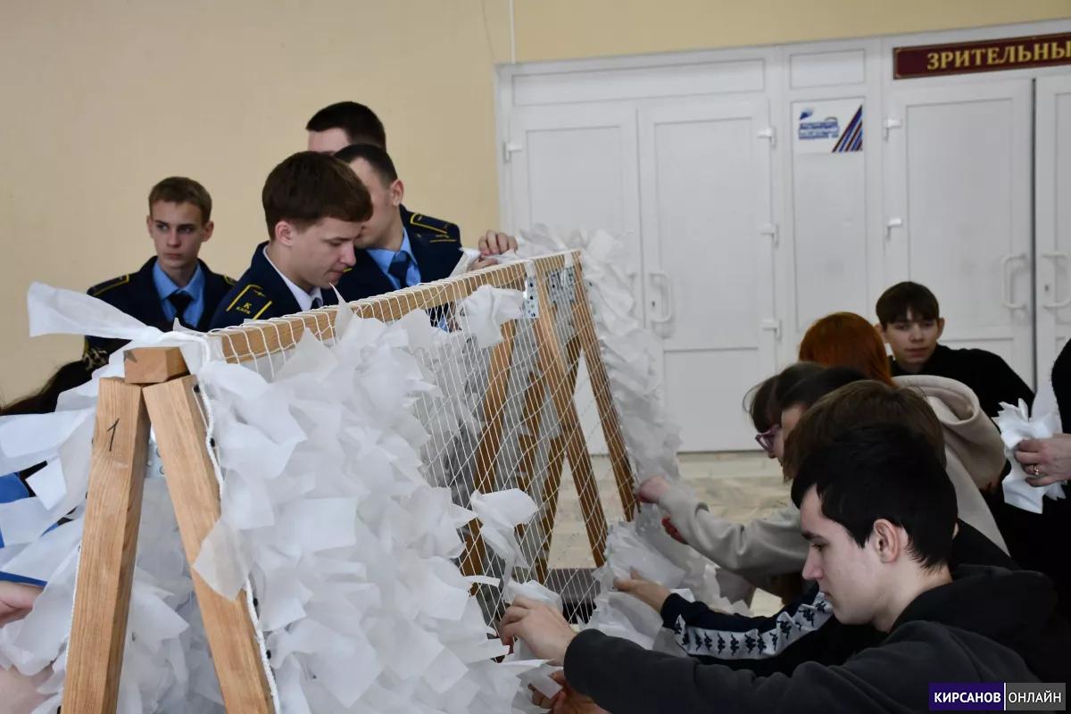 Ребята плели маскировочную сеть, активно работая в команде и поддерживая друг друга на каждом этапе работы.